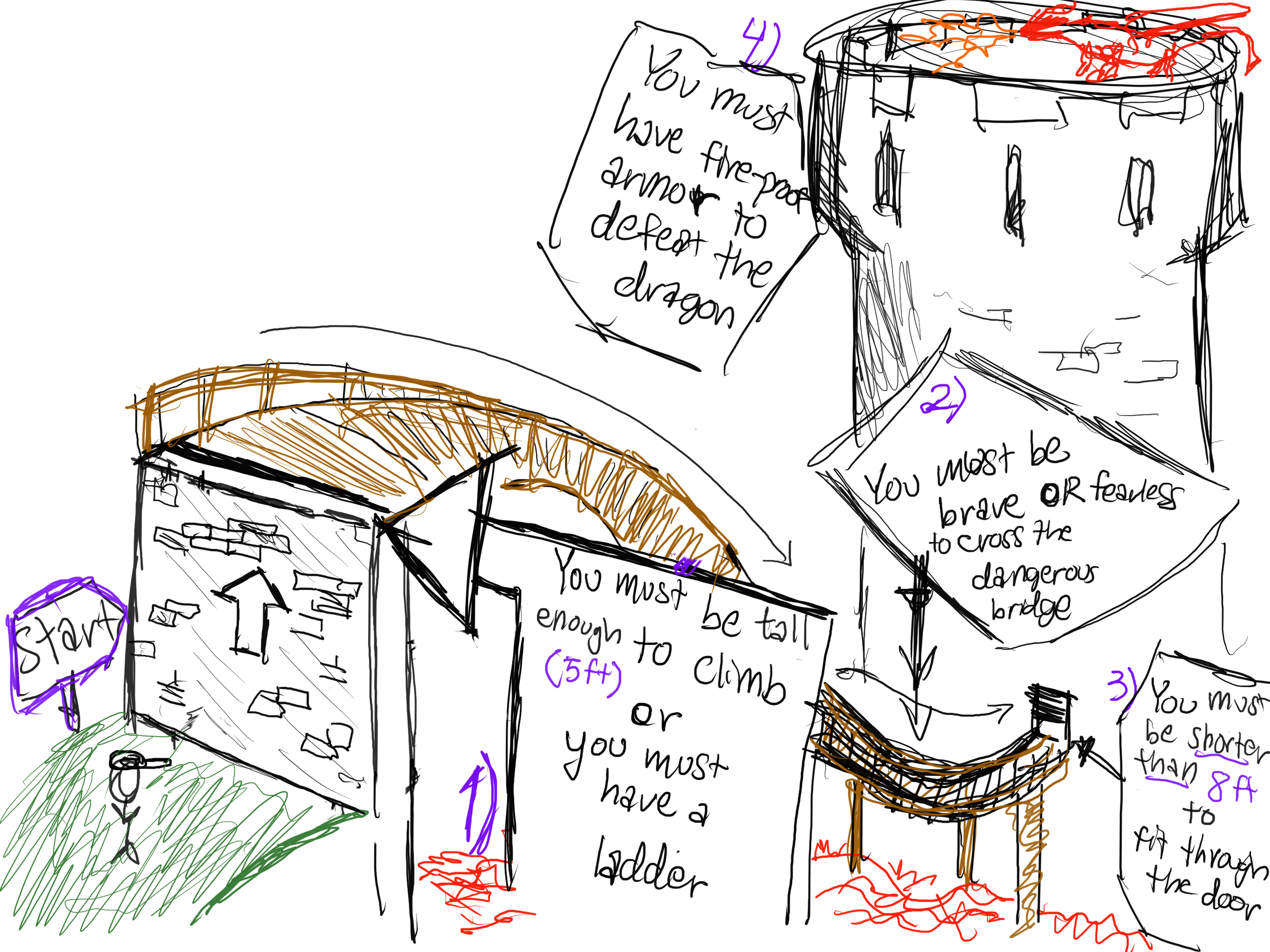 Students need to interpret this drawing to create a conditional structure that checks random variables to decide whether the hero can make it through the quest to defeat the dragon or not. I like giving examples that require taking a visual scenario and figuring-out how to express it in code.