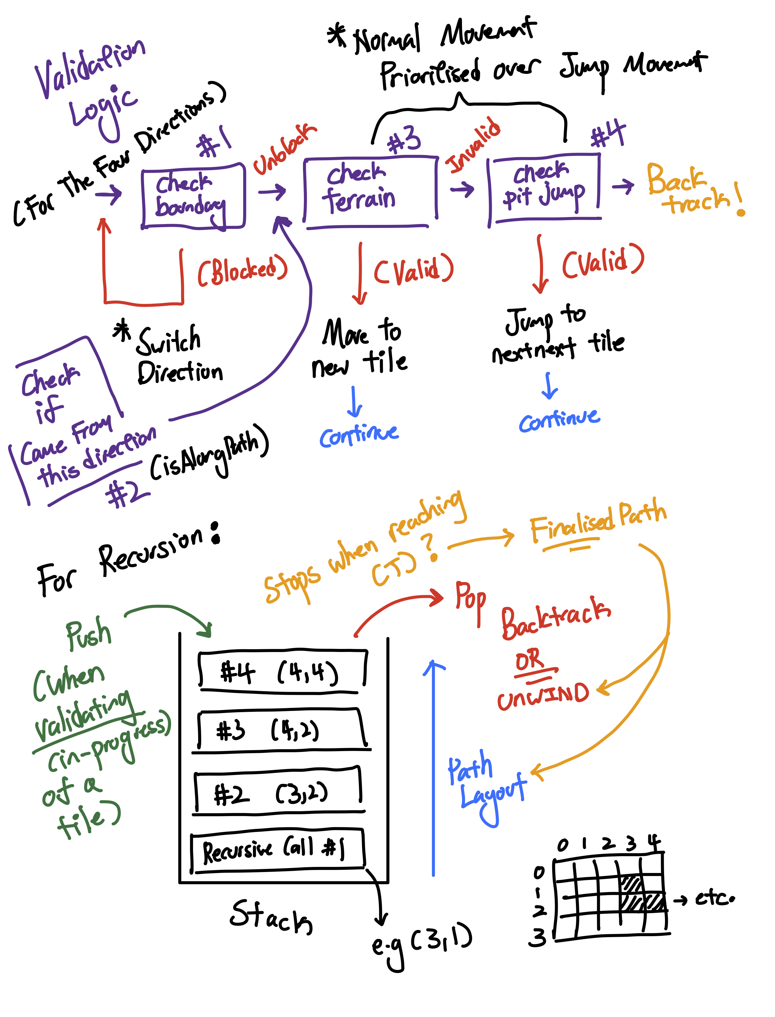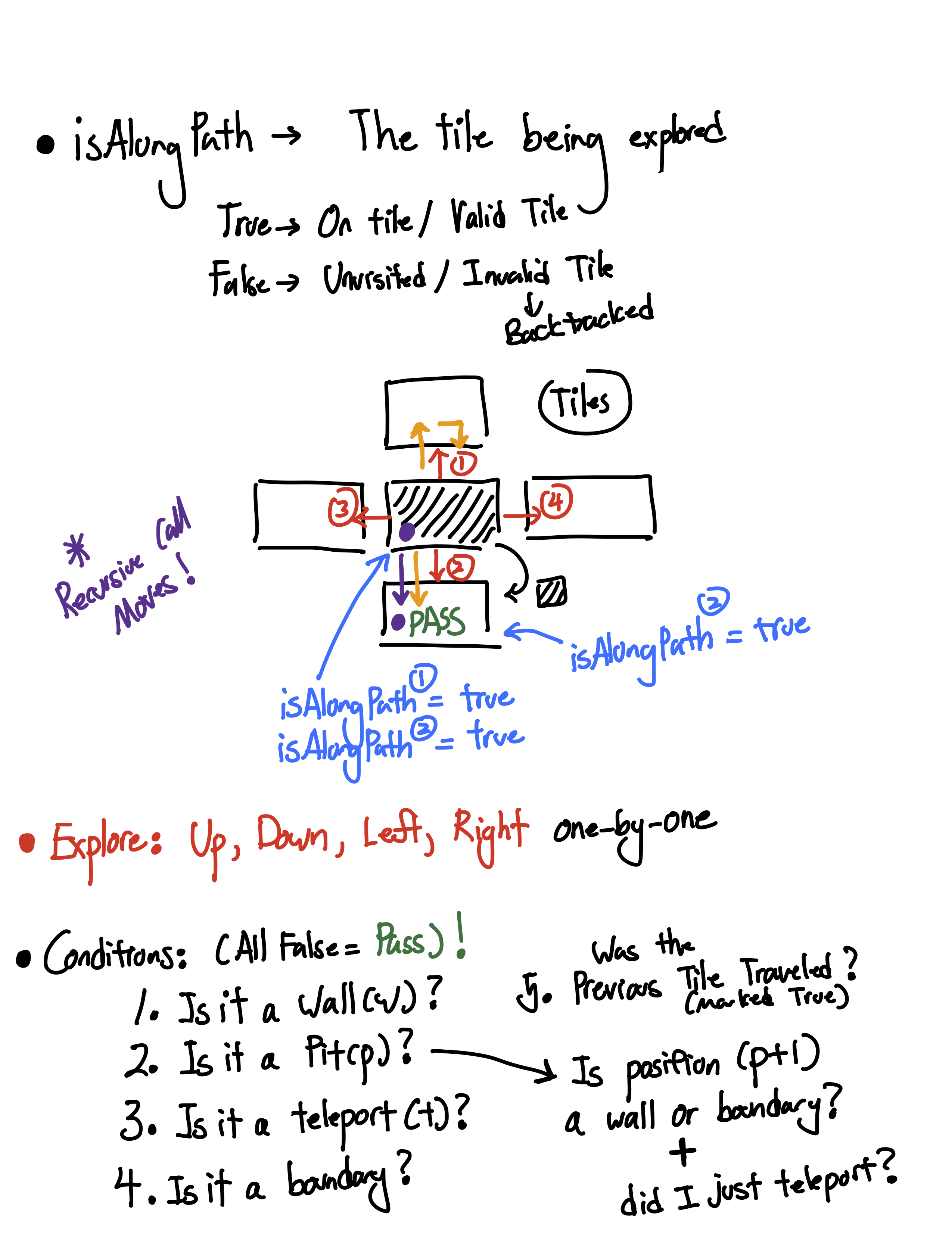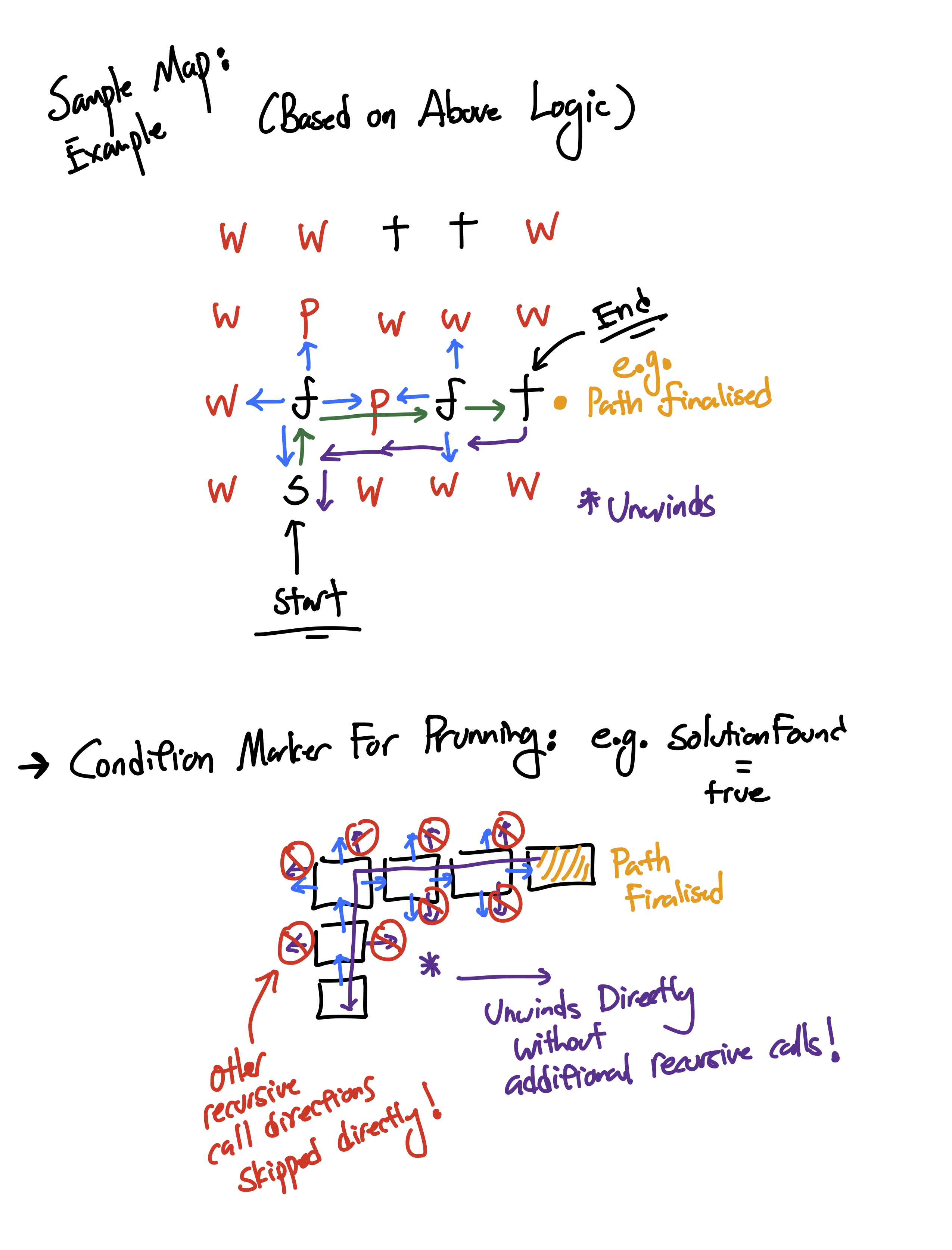I believe it's valuable to introduce the idea of drawing and designing ideas first before coding, in preparation for interaction with team-mates. This is an anonymized example collected with a student's permission showing the process of solving a recursive algorithm for exploring a maze featuring time-travel between different versions of the maze in search of a machine to destroy in the past.